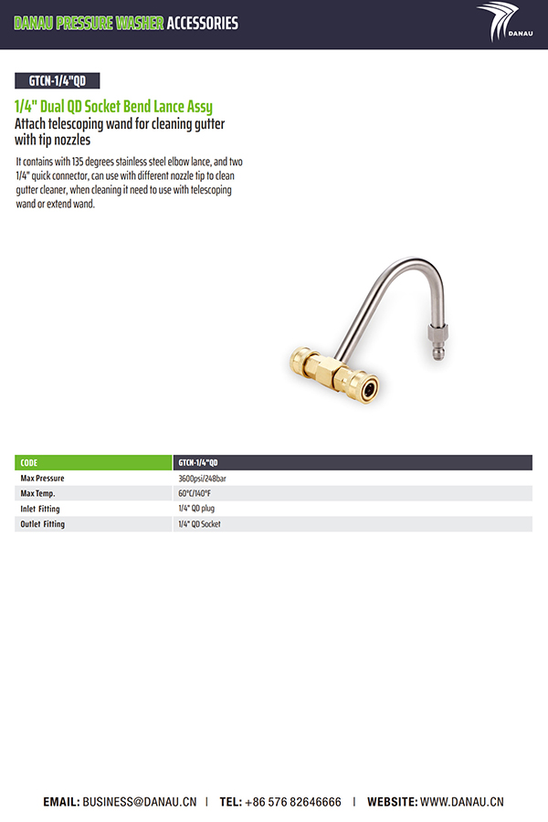 代码:GTCN-1/4"QD 安装伸缩杆,用于清洁带有尖端喷嘴的排水沟。它包含 135 度不锈钢弯头枪和两个 1/4 英寸快速连接器,可与不同的喷嘴尖端一起使用来清洁排水沟清洁剂,清洁时需要与伸缩杆或延伸杆一起使用。