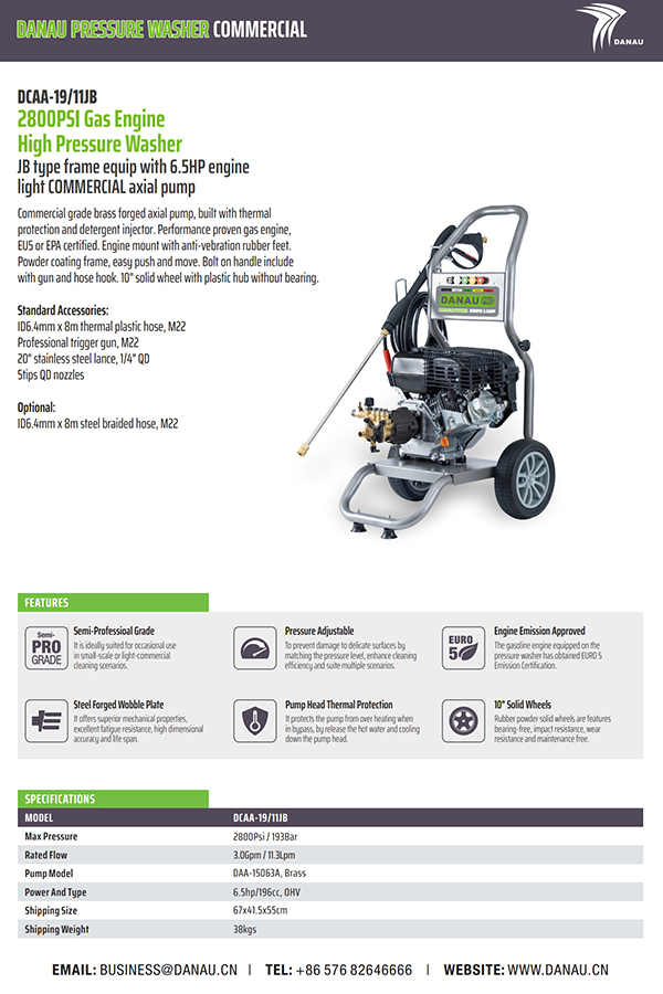 商用级黄铜锻造轴向泵,配有热保护和洗涤剂喷射器。经过性能验证的燃气发动机,经过 EU5 或 EPA 认证。带有防震橡胶脚的发动机支架。粉末涂料框架,易于推动和移动。手柄上的螺栓包括枪和软管钩。10 英寸实心轮,带塑料轮毂,无轴承。