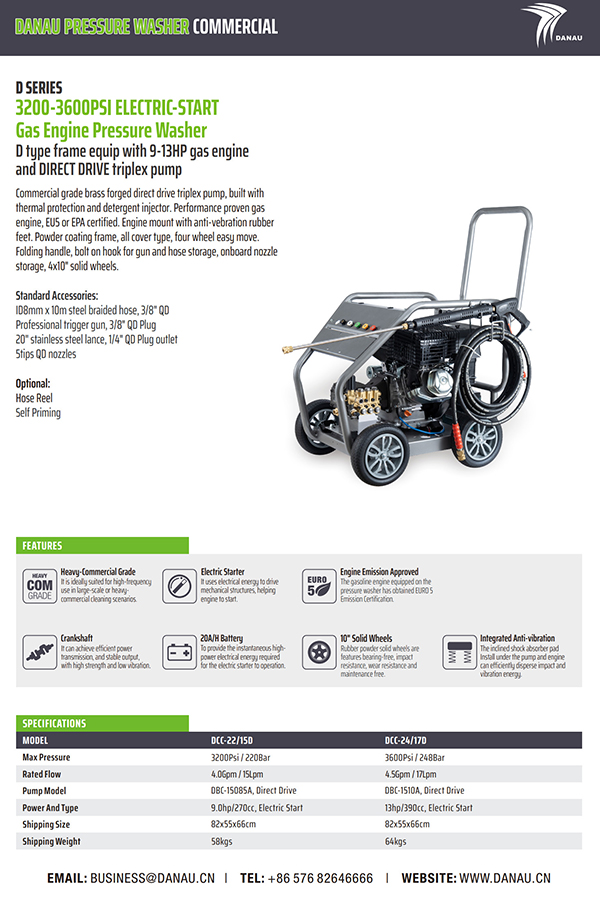 商用级黄铜锻造直接驱动三联泵,配有热保护和洗涤剂喷射器。经过性能验证的燃气发动机,经过 EU5 或 EPA 认证。带有防震橡胶脚的发动机支架。粉末涂料框架,全盖式,四轮易移动。折叠手柄、用于存放枪支和软管的螺栓钩、机载喷嘴存放、4x10 英寸实心轮。