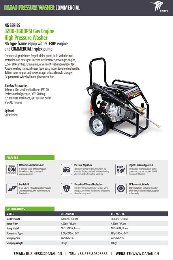商用级黄铜锻造三联泵,配有热保护和洗涤剂喷射器。经过性能验证的燃气发动机,经过 EU5 或 EPA 认证。带有防震橡胶脚的发动机支架。粉末涂料框架,全覆盖型,移动方便。易于折叠的手柄、用于存放枪支和软管的螺栓钩、机载喷嘴存放、带一体式金属轮毂的 13 英寸气动轮。