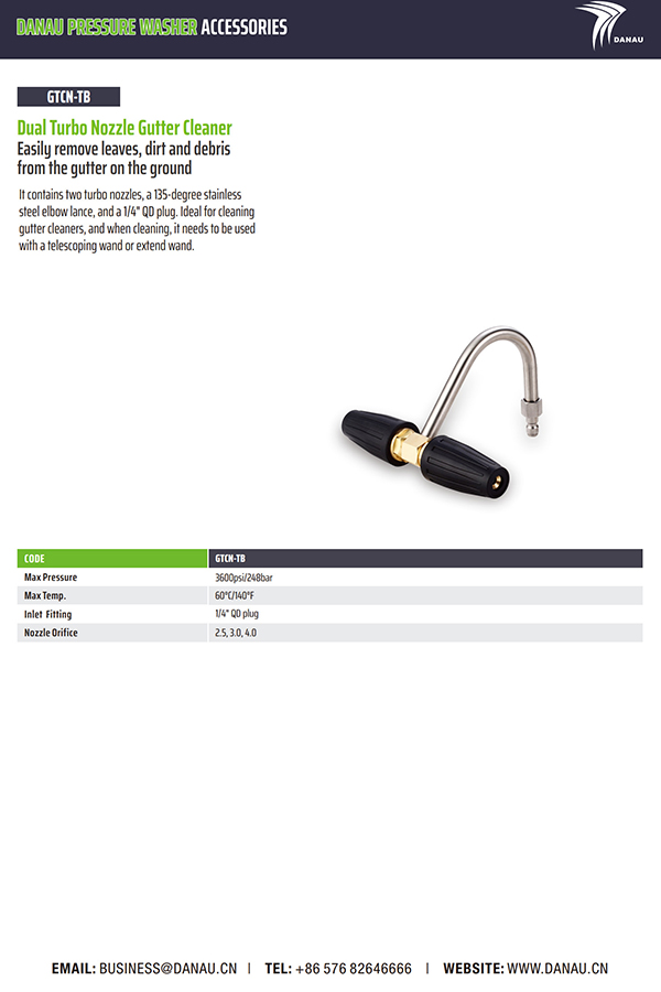 代码:GTCN-TB 轻松清除地面排水沟中的树叶、污垢和碎屑。它包含两个涡轮喷嘴、一个 135 度不锈钢弯头喷枪和一个 1/4 英寸 QD 插头。非常适合清洁排水沟清洁剂,清洁时需要与伸缩棒或延长棒一起使用。