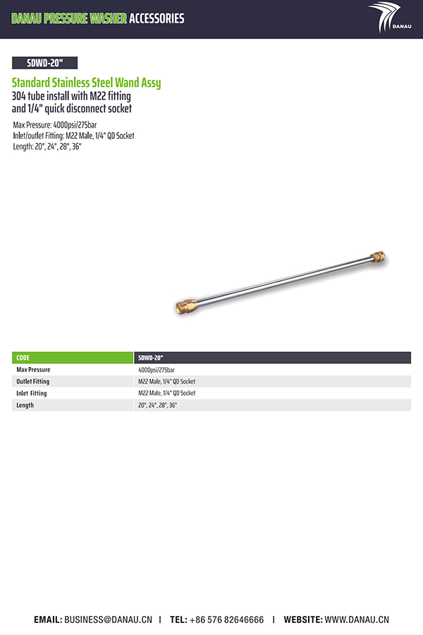 最大压力:4000psi/275bar 入口/出口配件:M22 公头,1/4 英寸 QD 插座