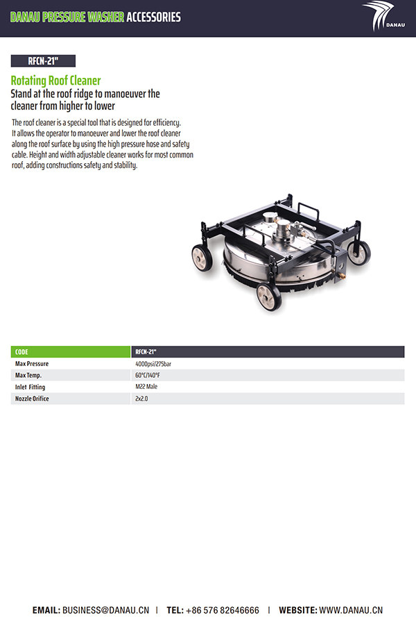 代码:RFCN-21" 站在屋脊处,将清洁器从高处移动到低处。屋顶清洁器是一种专为提高效率而设计的特殊工具。它允许操作员使用高压软管和安全电缆沿着屋顶表面操纵和降低屋顶清洁器。高度和宽度可调节的清洁剂适用于最常见的屋顶,增加了结构的安全性和稳定性。