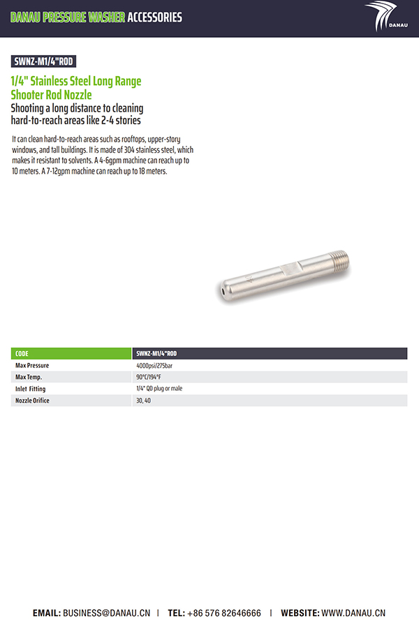 绣码:SWNZ-M1/4"ROD 长距离拍摄,清理2-4层等难以到达的区域。它可以清洁屋顶、高层窗户和高层建筑等难以到达的区域。它由 304 不锈钢制成,具有耐溶剂性。4-6gpm的机器可以达到10米。7-12gpm的机器可以达到18米。