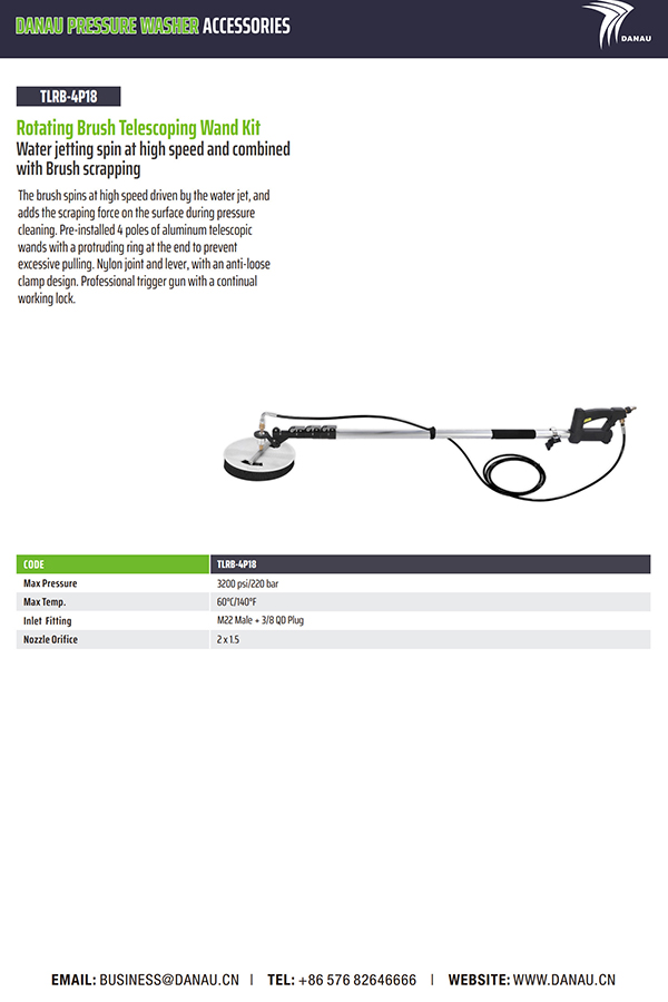 喷水高速旋转并与刷子刮削相结合。刷子在水流的驱动下高速旋转,并在压力清洁过程中增加表面的刮擦力。预装了 4 根铝制伸缩杆,末端有一个突出的环,以防止过度拉动。尼龙接头和杠杆,采用防松动夹具设计。具有持续工作锁的专业扳机枪。