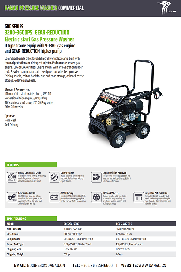 商用级黄铜锻造直接驱动三联泵,配有热保护和洗涤剂喷射器。经过性能验证的燃气发动机,经过 EU5 或 EPA 认证。带有防震橡胶脚的发动机支架。粉末涂料框架,全盖式,四轮易移动。折叠手柄、用于存放枪支和软管的螺栓钩、机载喷嘴存放、4x10 英寸实心轮。