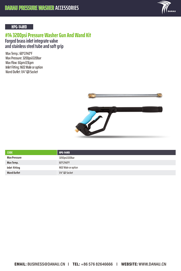 最大温子:60°C/140°F 最大压力:3200psi/220bar 大小流量:6Gpm/23Lpm 入口安装:M22 公头或选装件 棒出口:1/4 英寸 QD 插座