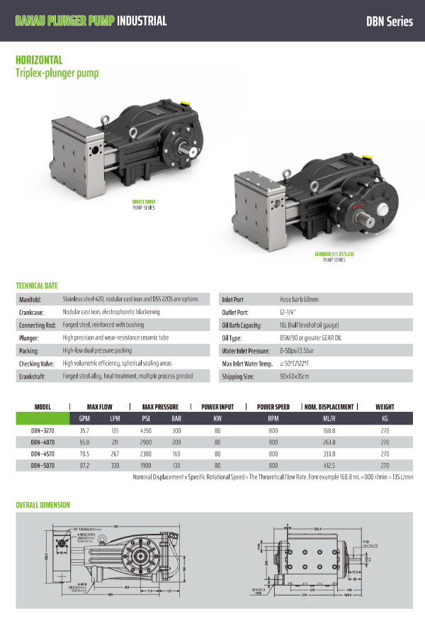 DBN系列工业柱塞泵具有多种连接类型,可与多种电源兼容。曲轴箱采用高强度合金铸铁精密铸造而成,曲轴采用高强度合金钢锻造而成,确保足够的材料强度。有不锈钢和双相钢可供选择。采用高性能陶瓷柱塞,具有优异的硬度、耐磨性、耐高温性和耐腐蚀性。双密封系统与入口和出口止回阀相结合,确保液压端的高效运行。泵头可连接各种配件,提供130–330L/min的稳定流量范围和13–30MPa的压力范围。