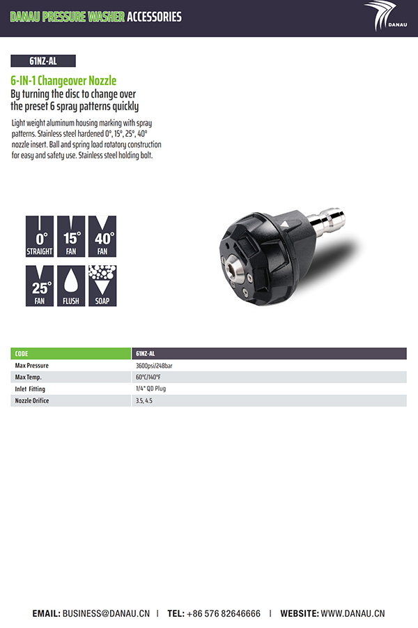 带有喷涂图案的轻质铝外壳标记。不锈钢硬化 0°、15°、25°、40° 喷嘴插入件。球和弹簧负载旋转结构,方便安全使用。不锈钢固定螺栓。