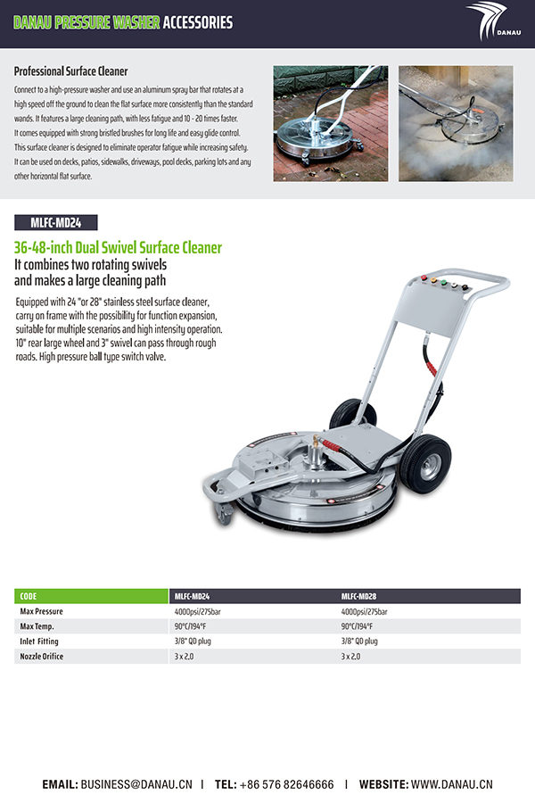 配备24英寸或28英寸不锈钢表面清洁器,可扩展功能的随身车架,适用于多种场景和高强度操作,10英寸后大轮和3英寸旋转可穿过崎岖道路。Hiqh压力球式开关阀。