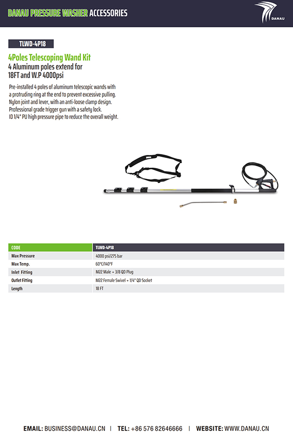 4 根铝杆可延伸 18 英尺,WP 4000psi。预装了 4 根铝制伸缩杆,末端有一个突出的环,以防止过度拉动。尼龙接头和杠杆,采用防松动夹具设计。带安全锁的专业级扳机枪。ID 1/4" PU 高压管,以减轻总重量。
