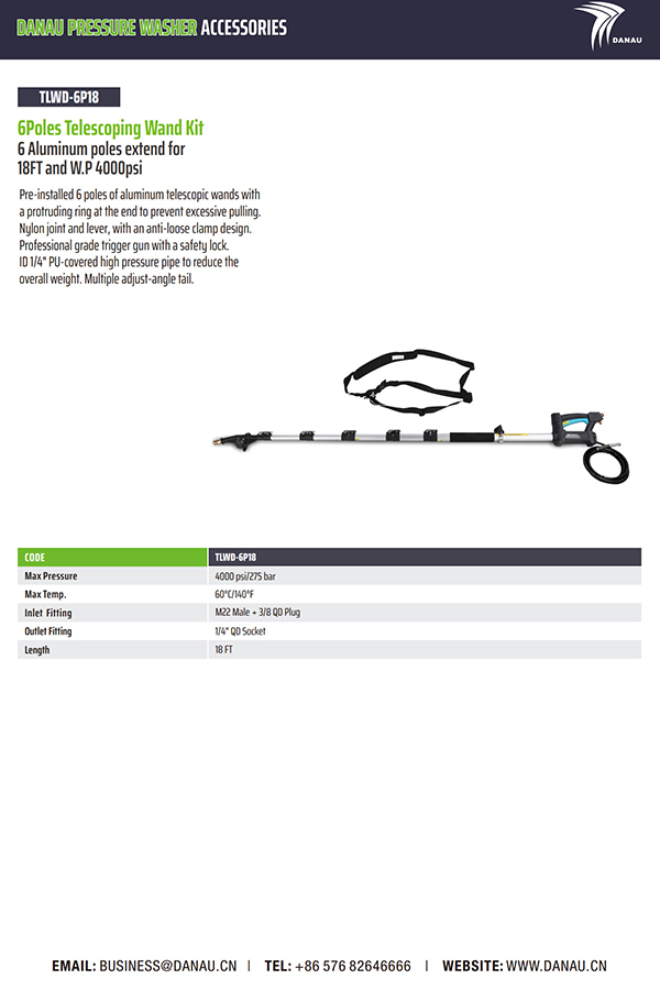 6 根铝杆可延伸 18 英尺,WP 4000psi。预装了 6 根铝制伸缩杆,末端有一个突出的环,以防止过度拉动。尼龙接头和杠杆,采用防松动夹具设计。带安全锁的专业级扳机枪。ID 1/4" PU 覆盖高压管,以减轻总重量。多调节角度尾部。